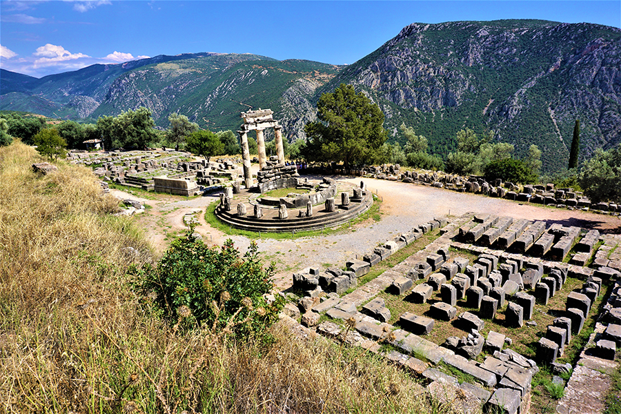 Le temple circulaire (tholos) est l’édifice le plus connu de Delphes et un monument très photographié. Il était situé dans le sanctuaire d’Athéna Pronaia (« devant le temple ») sur la terrasse inférieure. Athéna avait probablement une fonction de gardienne à Delphes et surveillait le sanctuaire de son demi-frère Apollon sur la terrasse supérieure.