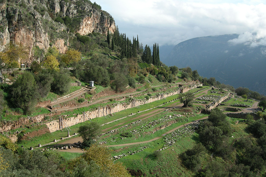 Delphes est située dans la campagne grecque de la région centrale de Phokis, l’actuelle Phocide, sur une pente abrupte au pied du mont Parnasse, au-dessus du golfe de Corinthe. La terre est très active sur le plan sismique et de nombreuses sources jaillissent de ses profondeurs. Les tremblements de terre et les éboulements ne sont pas chose rare.